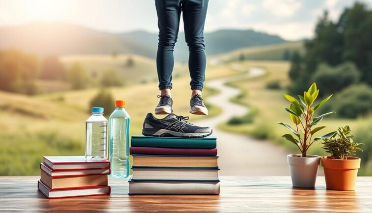 To succeed, we must focus on healthy habits that match our goals. This means setting aside time for exercise, eating right, and sleeping enough. Small changes, like starting with 5 pushups, can help stick to habits19. Breaking habits into smaller steps, like meditating in two 10-minute sessions, makes them easier to follow19.